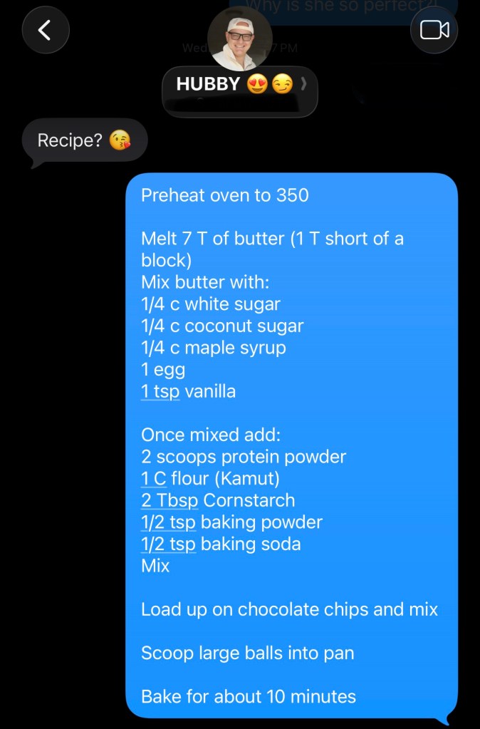 This was a TikTok trend I saw and could NOT get out of my head. Think half-baked chocolate chip cookie. It’s warm, gooey, and the perfect amount of sweet. I’m a nightly snacker, but typically try to utilize my late-night eats to get in a little more protein while limiting sugar. So I took the trend and tweaked it to better meet those goals, and it did NOT disappoint. We have been eating them so often that I taught Easton how to make them. Here’s the “husband-friendly” recipe: